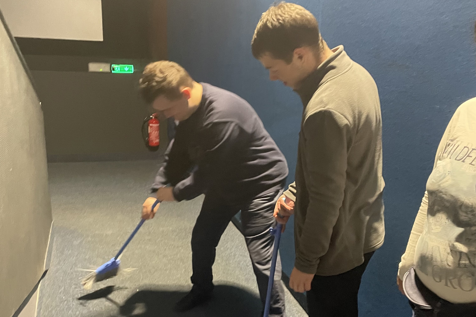 Po dużej dawce wiedzy teoretycznej przyszedł czas na praktykę! Z pełnym zaangażowaniem dołączyliśmy do pracy zespołu kina, wspólnie sprzątając salę po seansie i ucząc się, jak wygląda codzienna praca pracowników Heliosa.