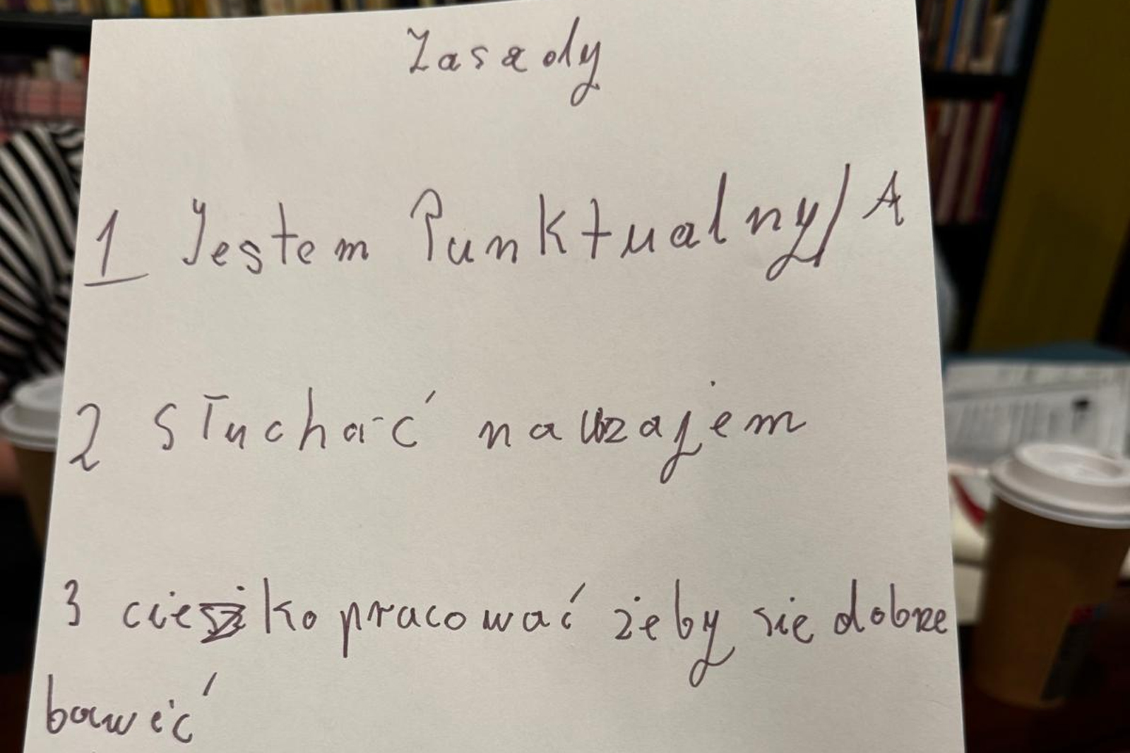 Warsztat rozpoczął się od krótkiej rozgrzewki i ustalenia zasad obowiązująceych podczas zajęć, które zostały zapisane na plakacie, aby każdy mógł się do nich odwoływać w trakcie spotkania.