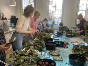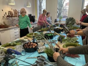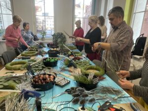 Równolegle do zajęć aktywizujących dla osób z niepełnosprawnością intelektualną, odbył się warsztat rozwijający zainteresowania dla rodziców i opiekunów naszych uczestników. Tym razem przenieśliśmy się w świat zapachu gałązek, szyszek i wstążek – pod czujnym okiem florystki Weroniki Kwiatek-Binda uczyliśmy się, jak tworzyć świąteczne wieńce dekoracyjne.
