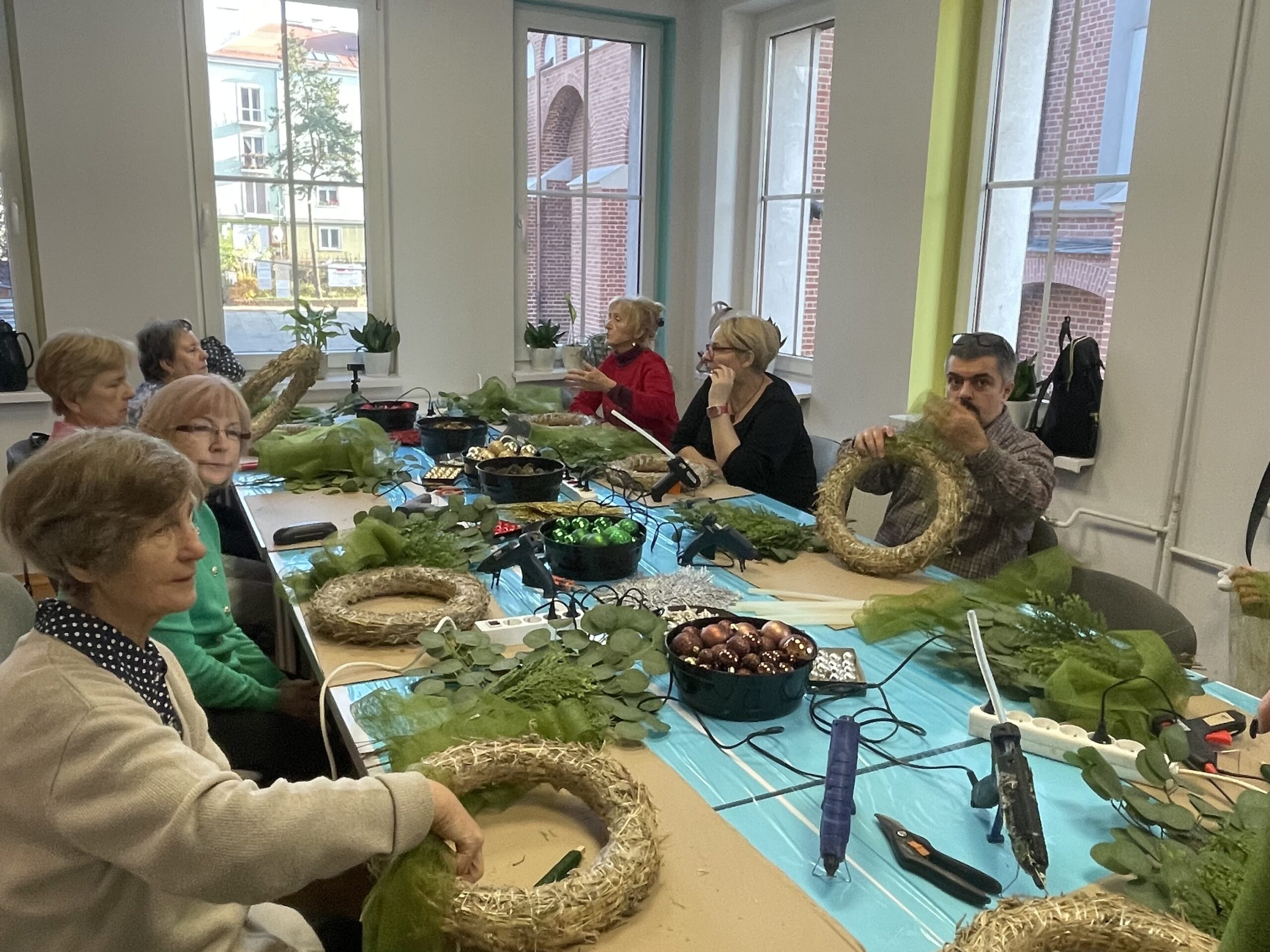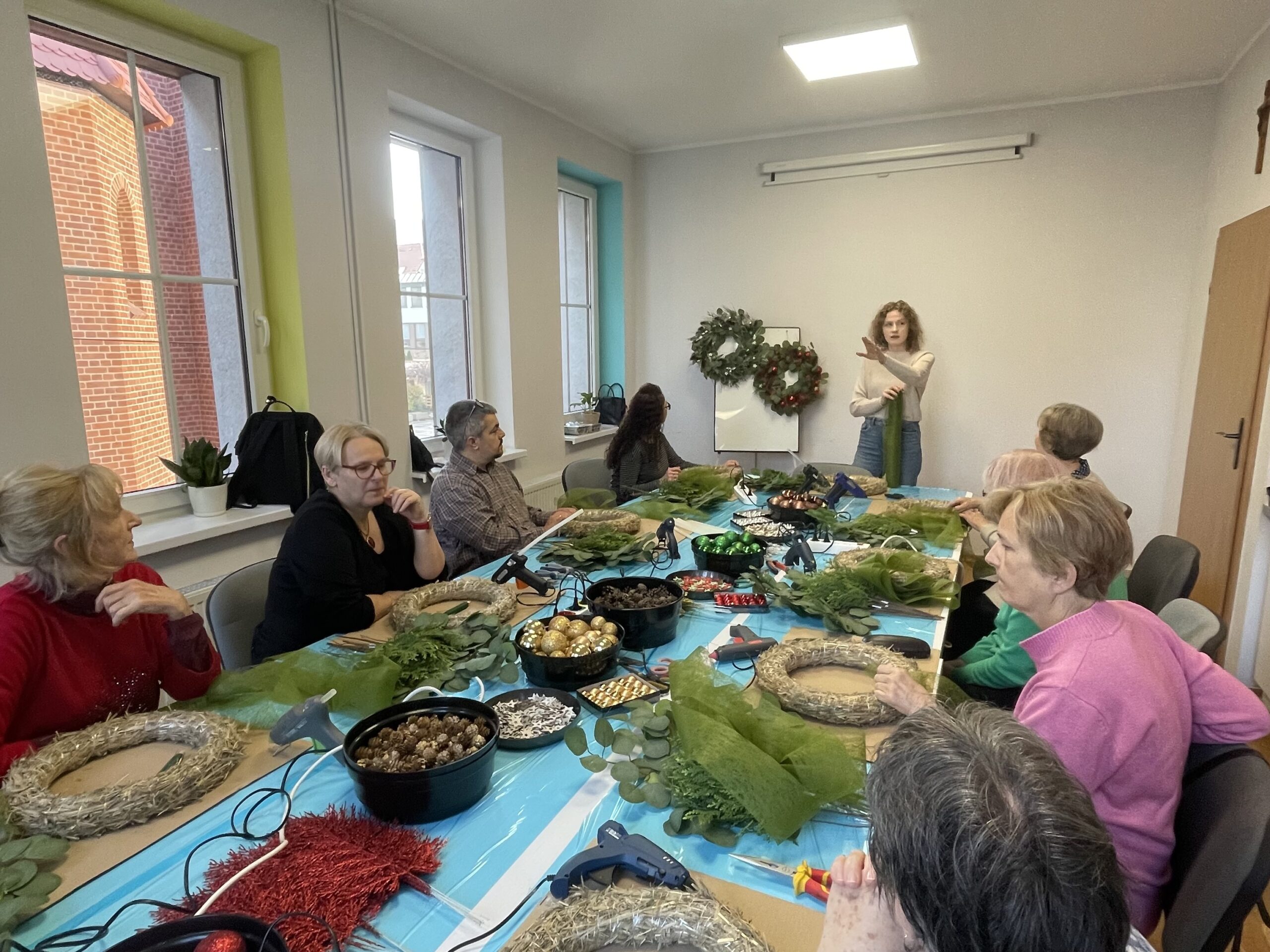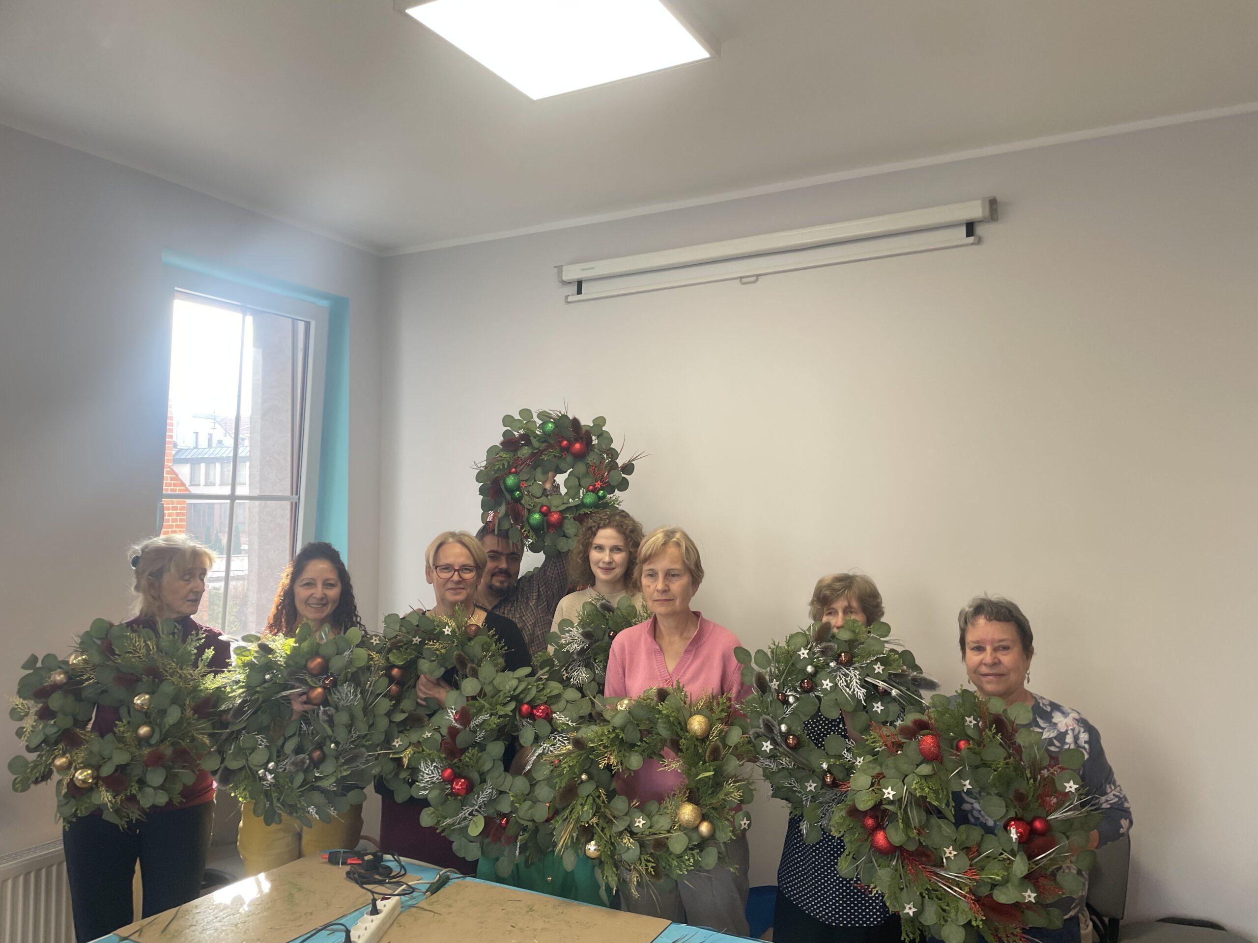 Równolegle do zajęć aktywizujących dla osób z niepełnosprawnością intelektualną, odbył się warsztat rozwijający zainteresowania dla rodziców i opiekunów naszych uczestników. Tym razem przenieśliśmy się w świat zapachu gałązek, szyszek i wstążek – pod czujnym okiem florystki Weroniki Kwiatek-Binda uczyliśmy się, jak tworzyć świąteczne wieńce dekoracyjne.