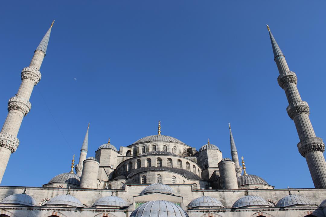Potem udaliśmy się na szklaneczkę świeżo wyciskanego soku z pomarańczy i granatu oraz małą przekąskę. Sił mieliśmy tyle że doszliśmy, aż do portu, gdzie odpoczywając na ławeczce podziwialiśmy zatokę Złoty Róg i most łączący Europę z Azją. Wybrzeżem wróciliśmy do Centrum starej części miasta, by odwiedzić Błękitny Meczet. Powstał w XVII wieku i miał przyćmić Hagię Sophię. Nie wiem czy to się udało, bo obydwie konstrukcje są wspaniale wyeksponowane i piękne na swój sposób.