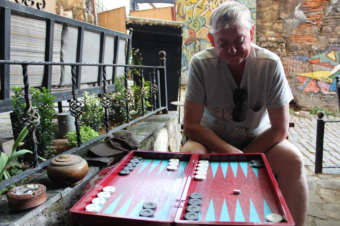 Turcja słynie ze wspaniale zaparzanych kaw i udało nam się taką wypić! Obok stolika stała Tavla. Jest to dobrze znana na południu gra planszowa, gdzie za pomocą kostek przesuwa się pionki. Połączenie szachów i chińczyka. Zagraliśmy partię i tym samym wpisaliśmy się w lokalny krajobraz, gdyż bardzo popularnym sposobem na spędzanie wieczoru w tych rejonach jest partyjka w Tavla przy kawie, herbacie lub shishy.